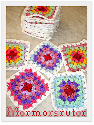 Mitt evighetsprojekt som jag hoppas blir klart till Alvas 1 års dag är en mormorsfilt. Så här långt har projektet kommit hitills. Har en hel del kvar som ni ser.